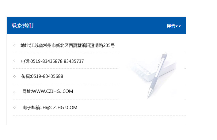 地址:常州市新北區友邦商務大廈1幢16、17層  電話:0519-85101652  傳真:0519-85112595  郵編:213022  網址:www_cz-jiayue_cn.lygxyhg.com  郵箱:xiajifengaa@163.com